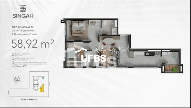 Com previsão de entrega para junho de 2026, este apartamento possui 58,92m², 2 quartos, sendo 1 suíte, e 1 vaga de garagem.