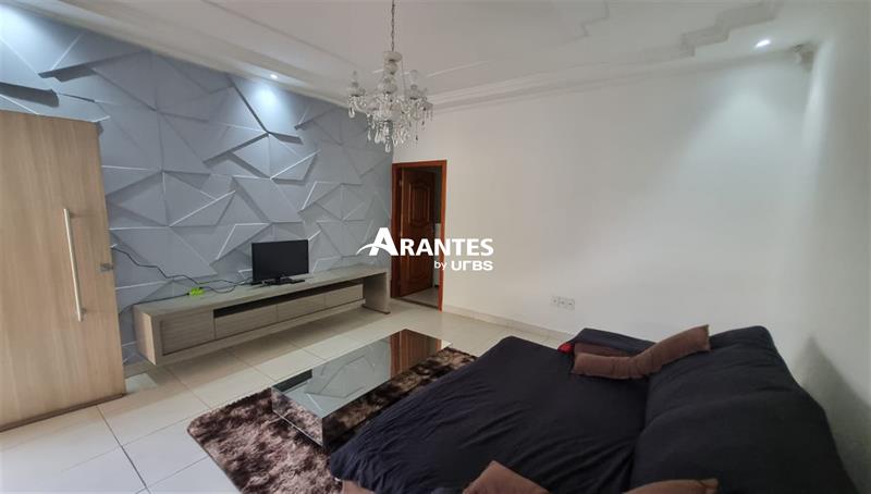 A sala, decorada com sanca de gesso e revestimento em placa 3D, oferece um toque moderno e elegante ao ambiente