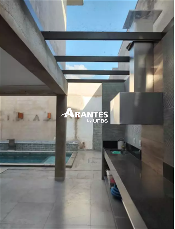 O pavimento inferior conta com dormitório, espaço gourmet, copa, piscina aquecida e varanda coberta