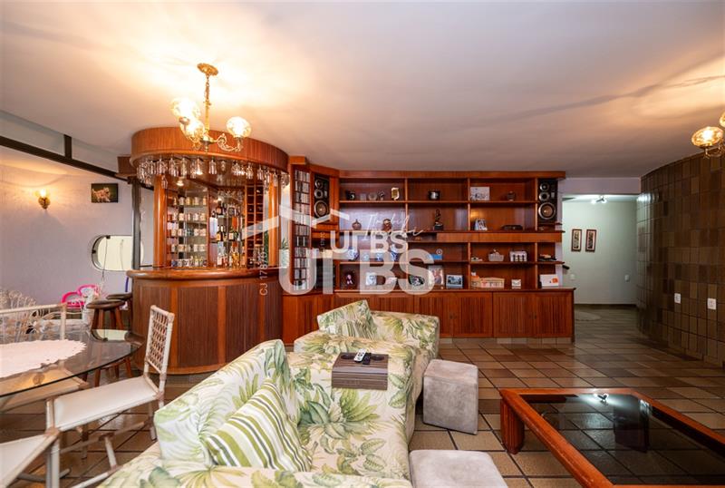 A sala ampla é um verdadeiro destaque, com uma estante de madeira que faz a ligação com um bar montado no mesmo material e estilo, criando um ambiente elegante e perfeito para receber convidados