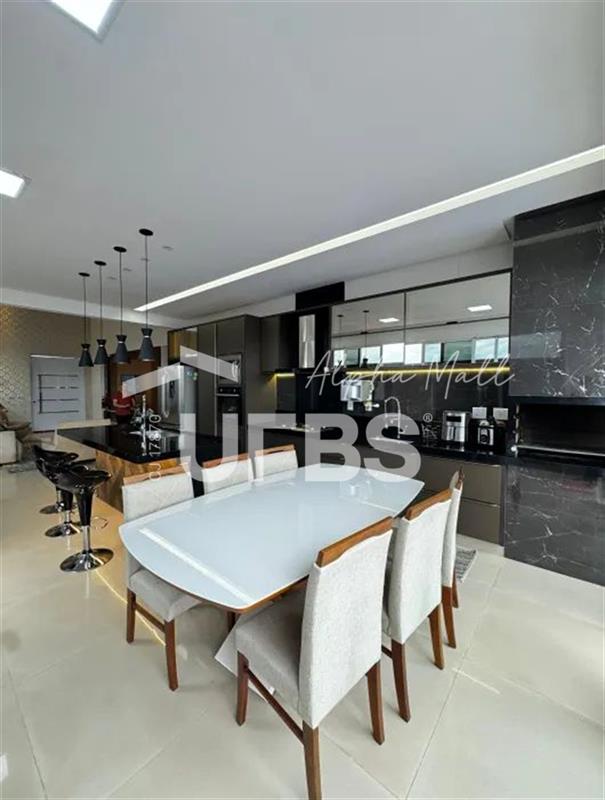 São 3 suítes plenas (sendo 1 master), sala ampla com pé direito duplo, cozinha com bancada em ilha e área gourmet integrada à piscina.