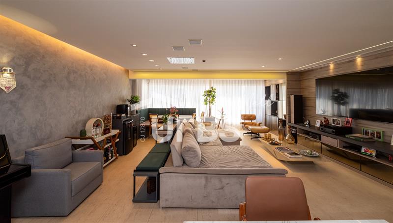 Sala para três ambientes, home theater italiano com projetor e telão, janelas amplas com vista definitiva, ar-condicionado em todos os cômodos e projeto luminotécnico de alto padrão.