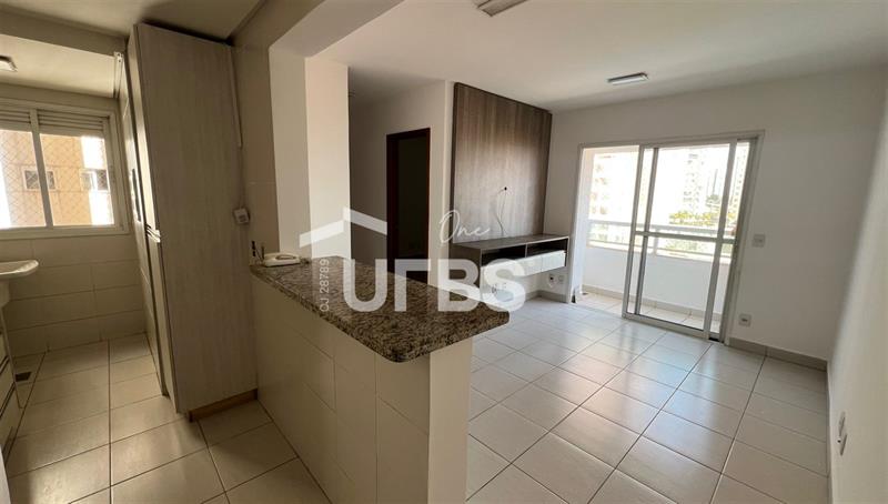 A cozinha americana é funcional, com bancada em granito que serve como balcão para refeições rápidas e integração com a sala