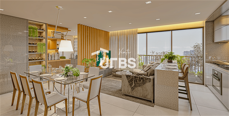 Conta com sala de jantar, lavabo, cozinha integrada à área de serviço, varanda conjugada com laje técnica, duas suítes, além de duas vagas de garagem e um escaninho