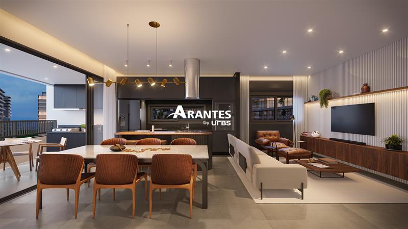 O living integrado valoriza a convivência e se estende à sacada gourmet com churrasqueira a gás, criando espaço para momentos de lazer e contemplação com vista privilegiada para o verde do parque.