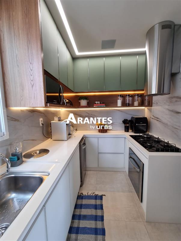 A cozinha é planejada com armários e a suíte, foi desenhada para entregar conforto absoluto, com um flap de TV no teto que permite relaxar de forma prática e elegante, além de armários que organizam o dia a dia sem esforço