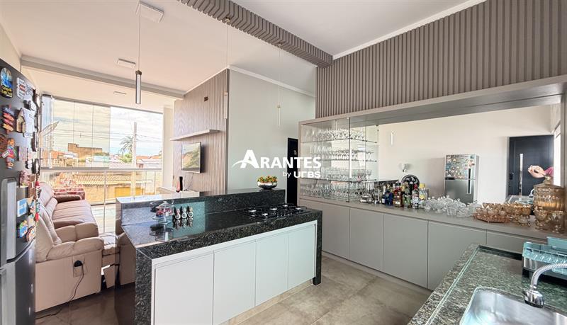 No piso superior, o apartamento com design elegante, apresenta uma sala ampla em 2 ambientes, valorizada por um pé direito de 3,70m e janelas em blindex de vidro temperado, além de um painel de TV planejado