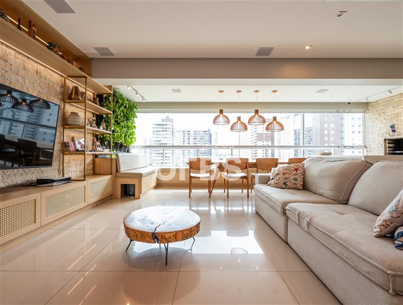 A sala ampla, com integração harmoniosa entre os ambientes, destaca-se pela decoração elegante e sofisticada, conectando-se à varanda gourmet, que se integra ao living de forma fluida e contemporânea.